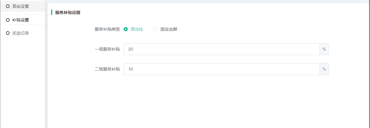 服务补贴励类型:可选择百分比或者固定奖励