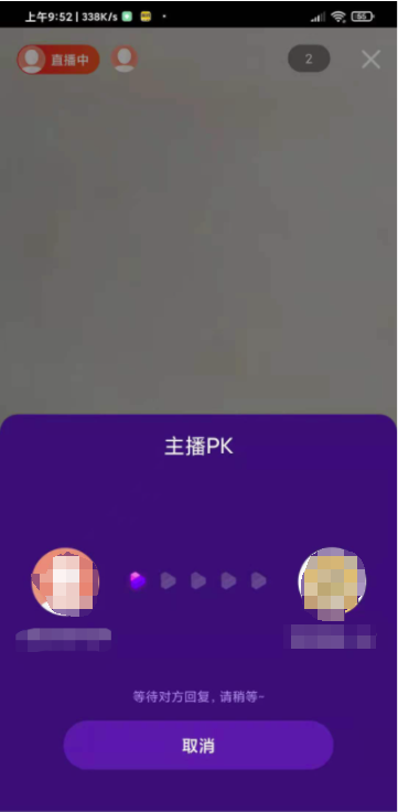 开播后点击pk按钮后可以连接正在直播中其他主播,并进行邀请连麦