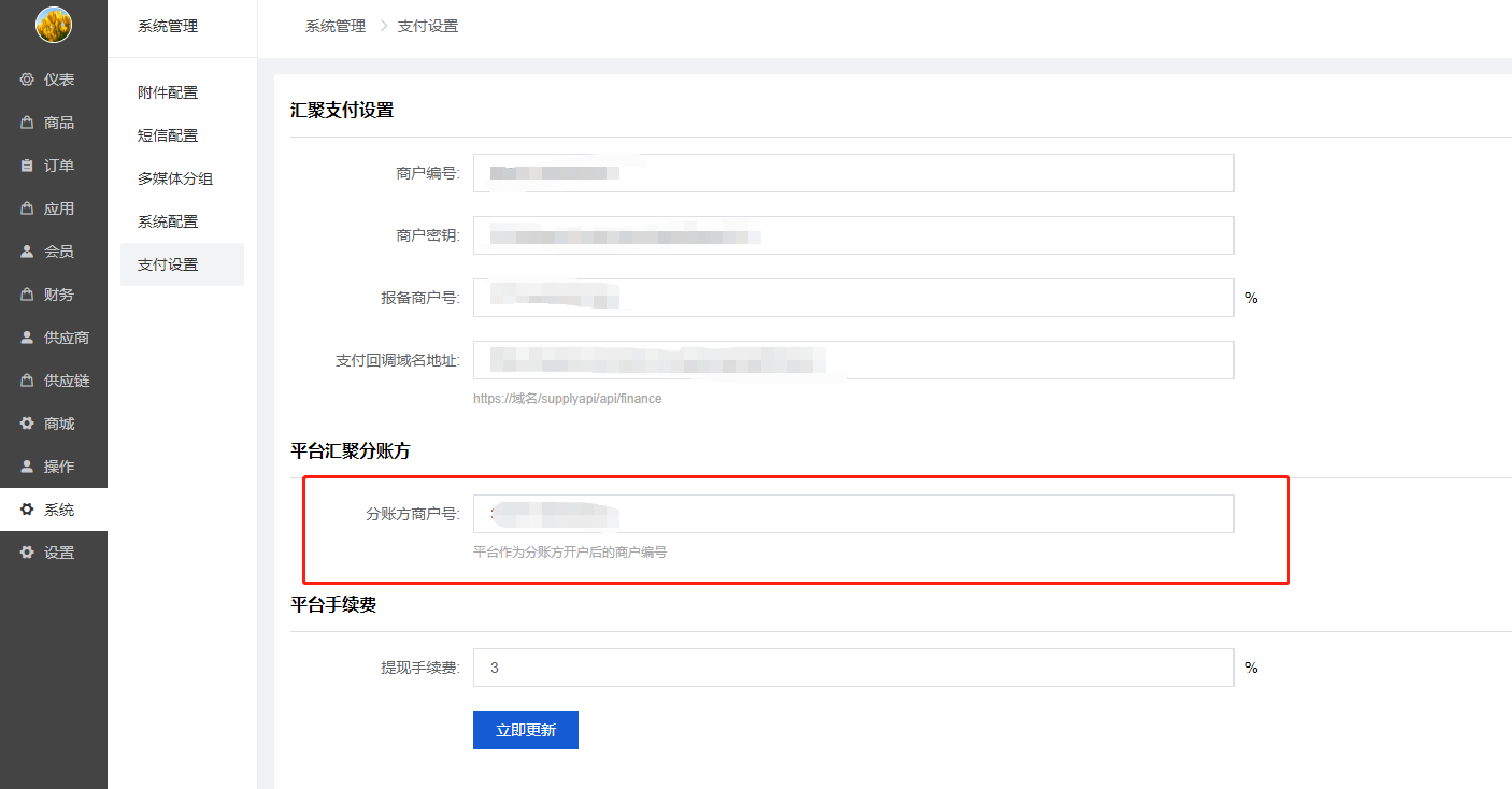 平台在供应链中本身也是分账方,需要在财务中增加开户,开户后的分账方编号填写在此处
