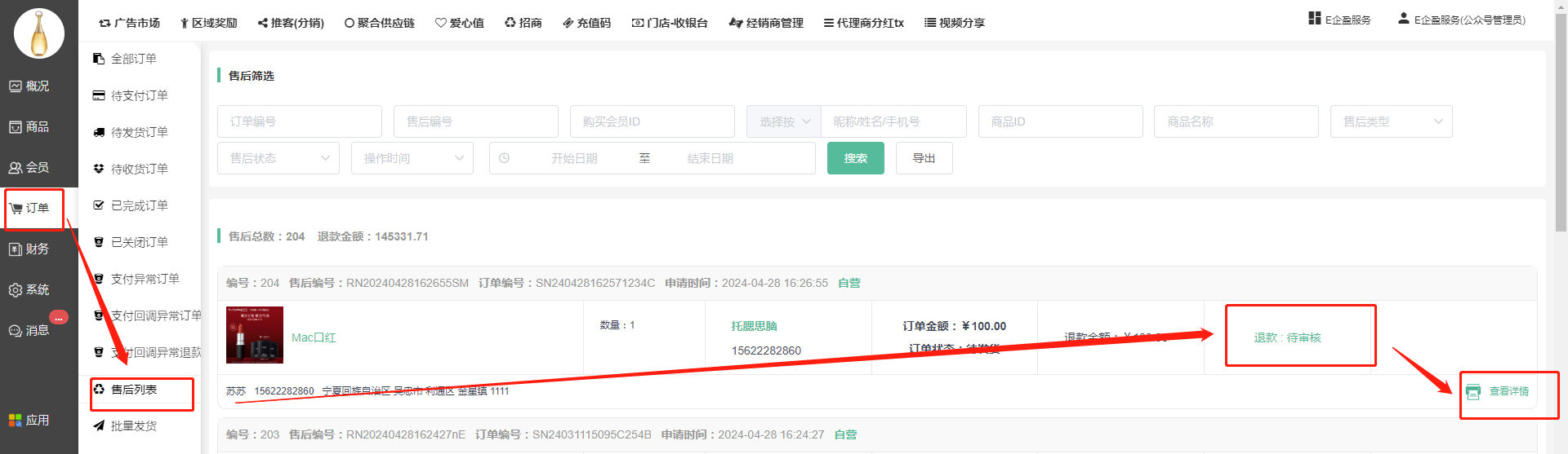 后台--订单--售后列表--找到需要审核的订单(该笔订单退款退货)--点击查看详情,如下图所示: