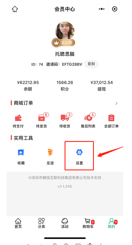 1.该会员在手机端进入商城个人中心,找到设置