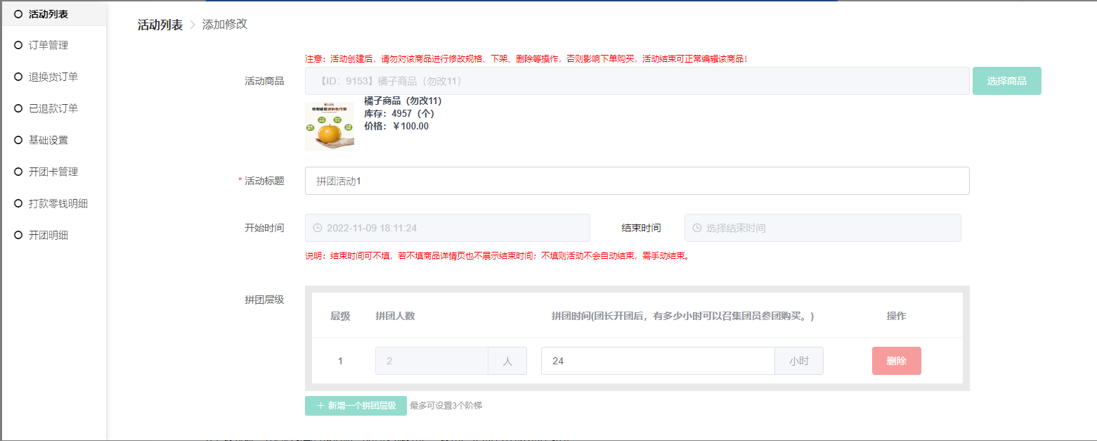 4) 拼团层级:最多可设置三个阶梯,设置好后不可修改