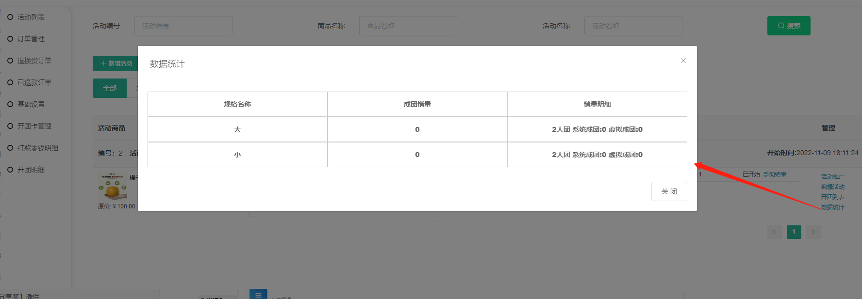 5, 数据统计:点击可查看到该活动的成团销量和销量明细