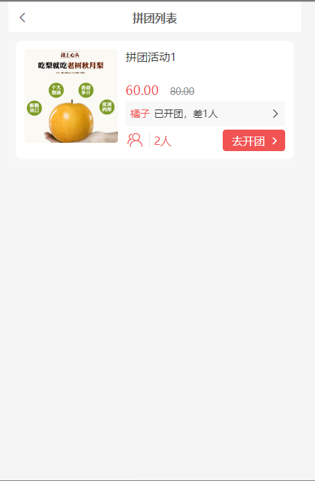 1, 在拼团活动聚合页可查看到已开始、未结束的拼团活动,在此列表可查看到拼团活动名称、拼团最低金额,拼团最低金额所需人数,拼团中拼团(后台基础设置需要开启),点击去开团跳转到拼团活动详情页