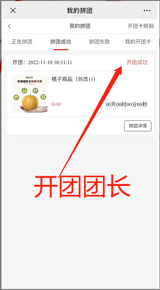 4, 拼团成功:状态处团长显示开团成功,拼团会员显示拼团成功