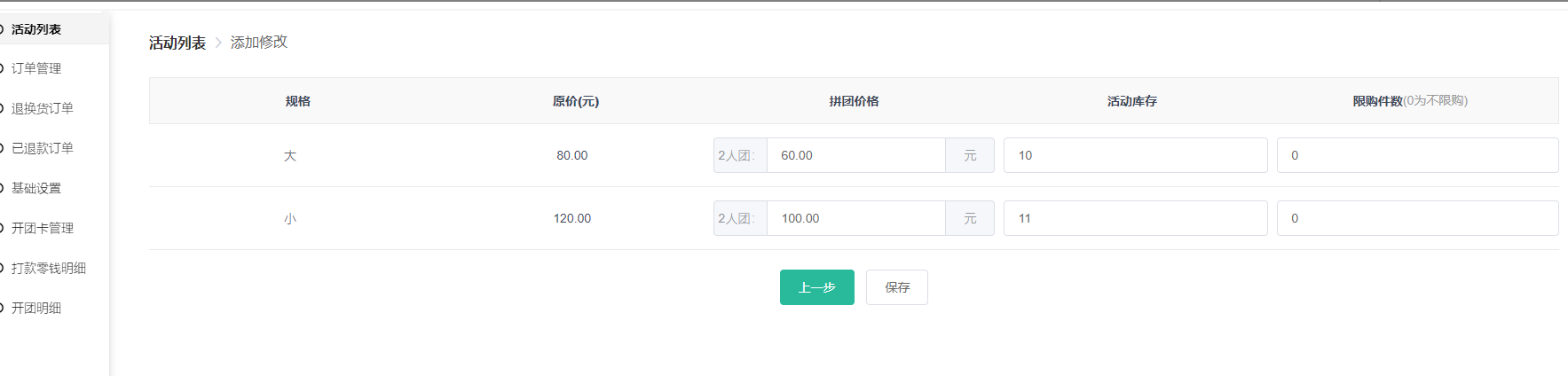 15) 拼团价格:可设置不同层级不同价格,设置保存后不可修改