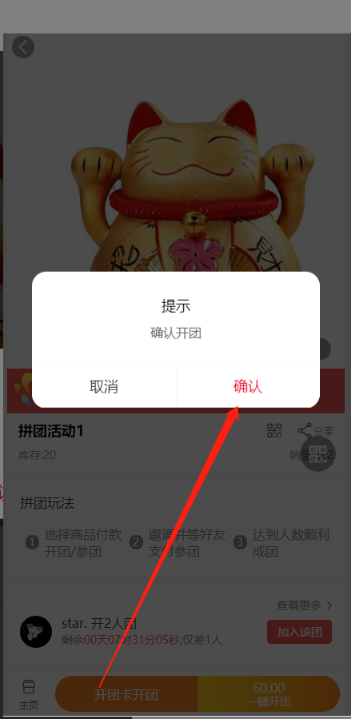 2, 在活动详情页可选择开团/参团