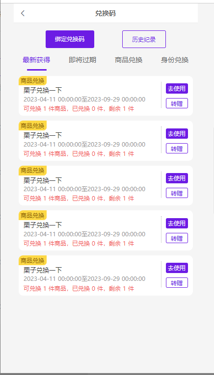 点击历史记录,则会显示已兑换,已转增,已过期的信息