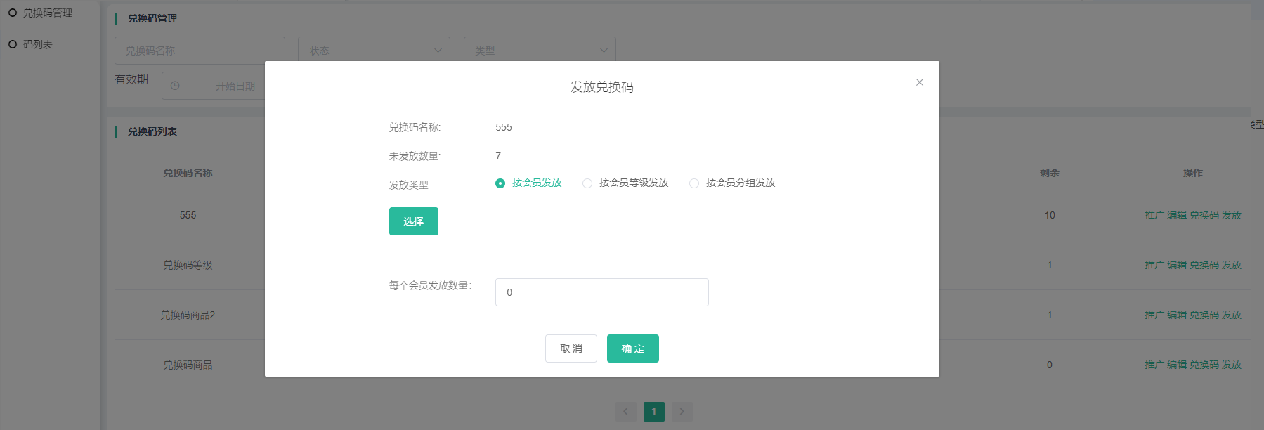 发放:显示兑换码名称,未发放数量,可以选择发放类型(按会员发放,按会员等级发放,按会员组,兑换码区间发放),每个人会员发放数量~