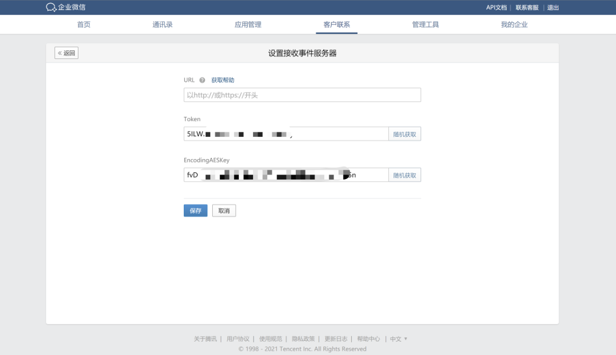 设置完成客户管理secret、客户变更通知token、客户变更通知aseKey后,请务必要先提交保存设置,在点击企业微信官方后台--客户联系中的设置接收事件服务器中的保存。