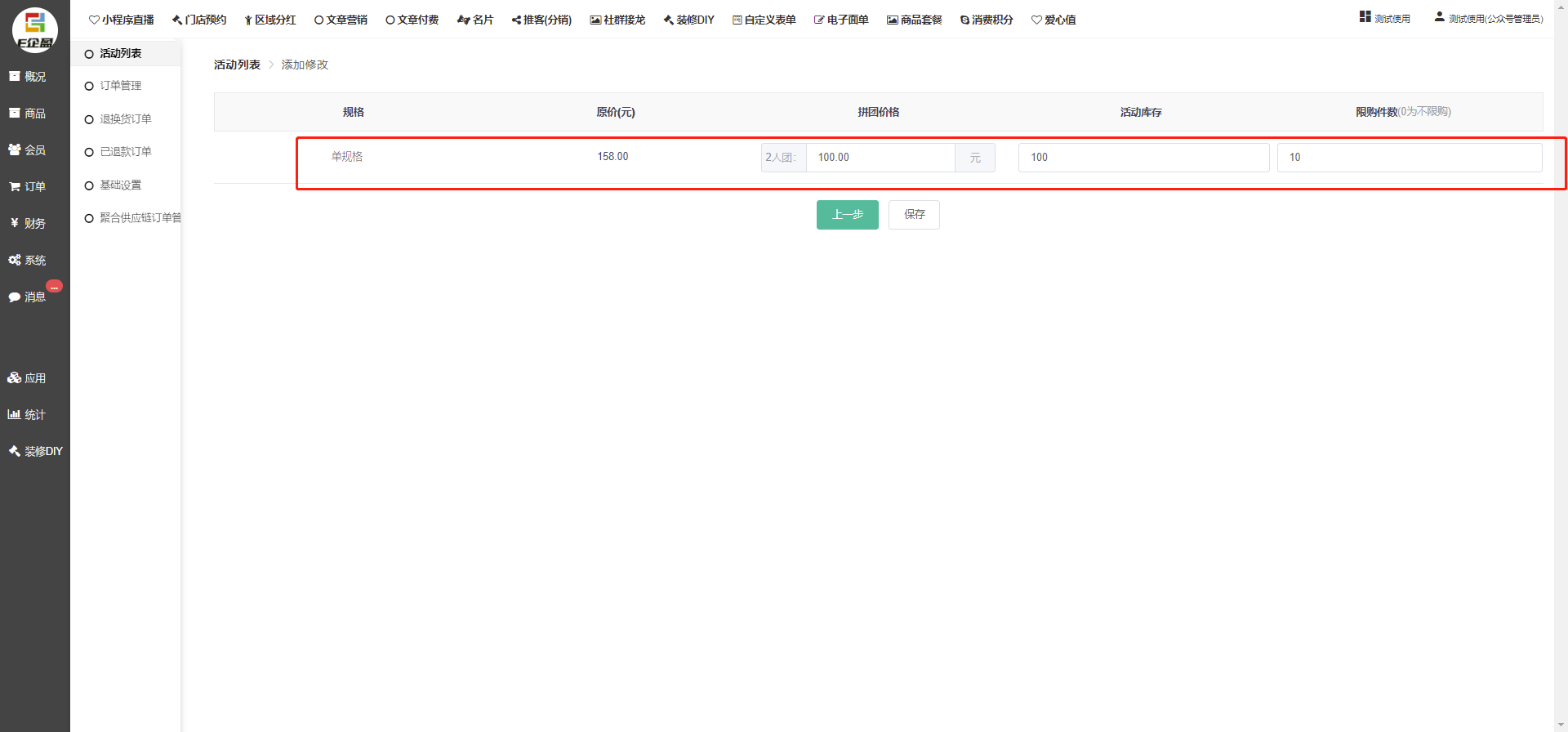 不同的开团人数可设置不同的价格、拼团活动库存、限购件数