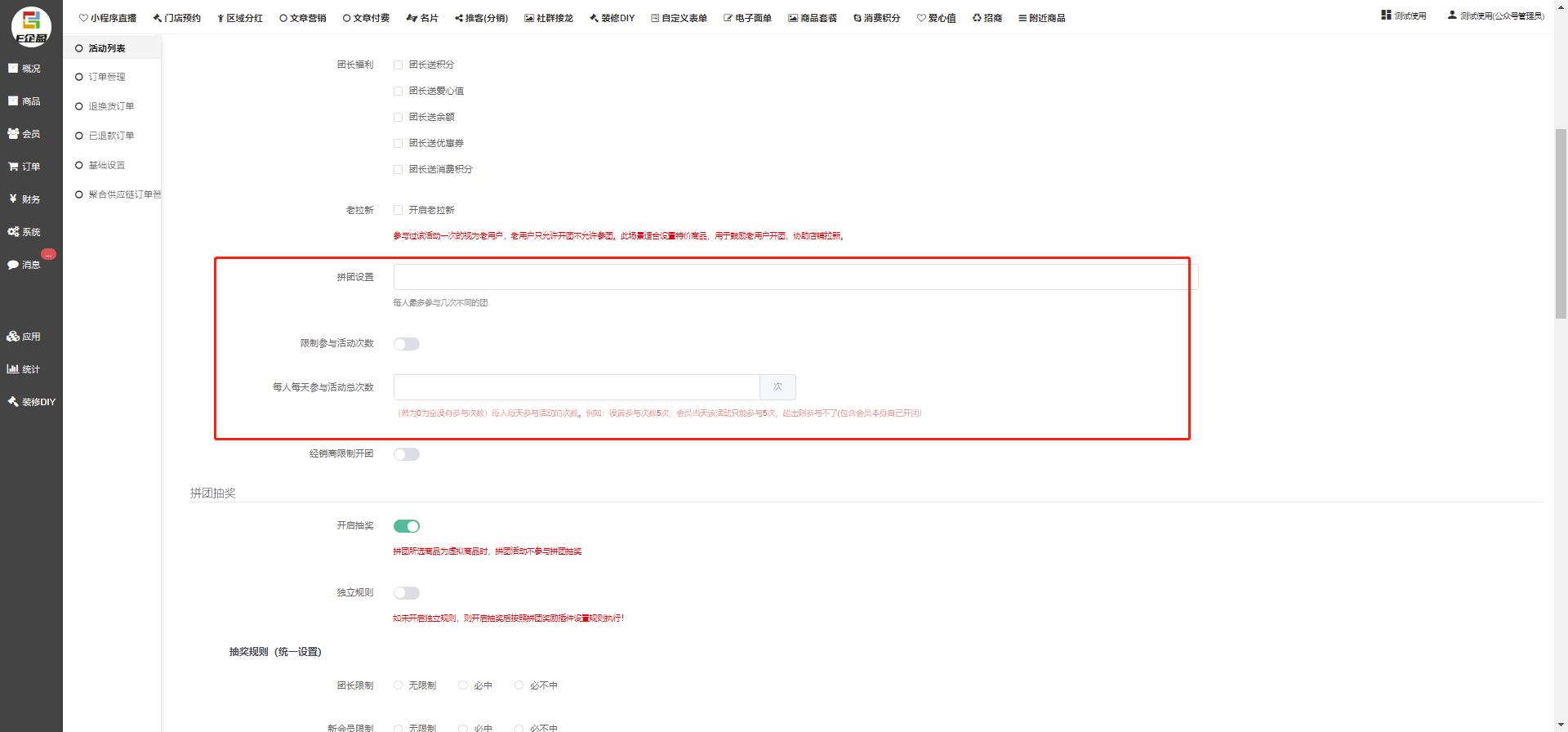 功能概述:支持平台自营商品、门店商品、供应链商品。平台可以创建多个拼团活动,每个活动指定一个产品;支持设置阶梯团、团长送积分、老拉新等,支持后台手动成团。店铺装修支持拼团组件,将拼团活动通过装修DIY功能在自定义页面显示